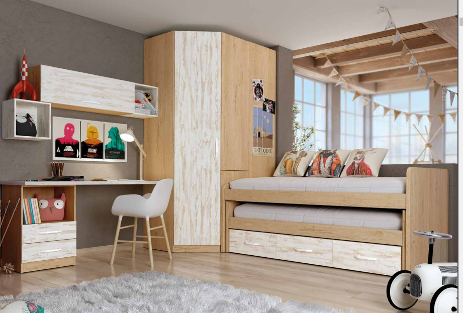 • Dormitorio juvenil compuesto por compacto doble cama + 3 cajones, armario rinconero angular, cubo de colgar, alto 1 puerta elevable, sobre mesa estudio con bajo 2 cajones + hueco + pata soporte ángulo